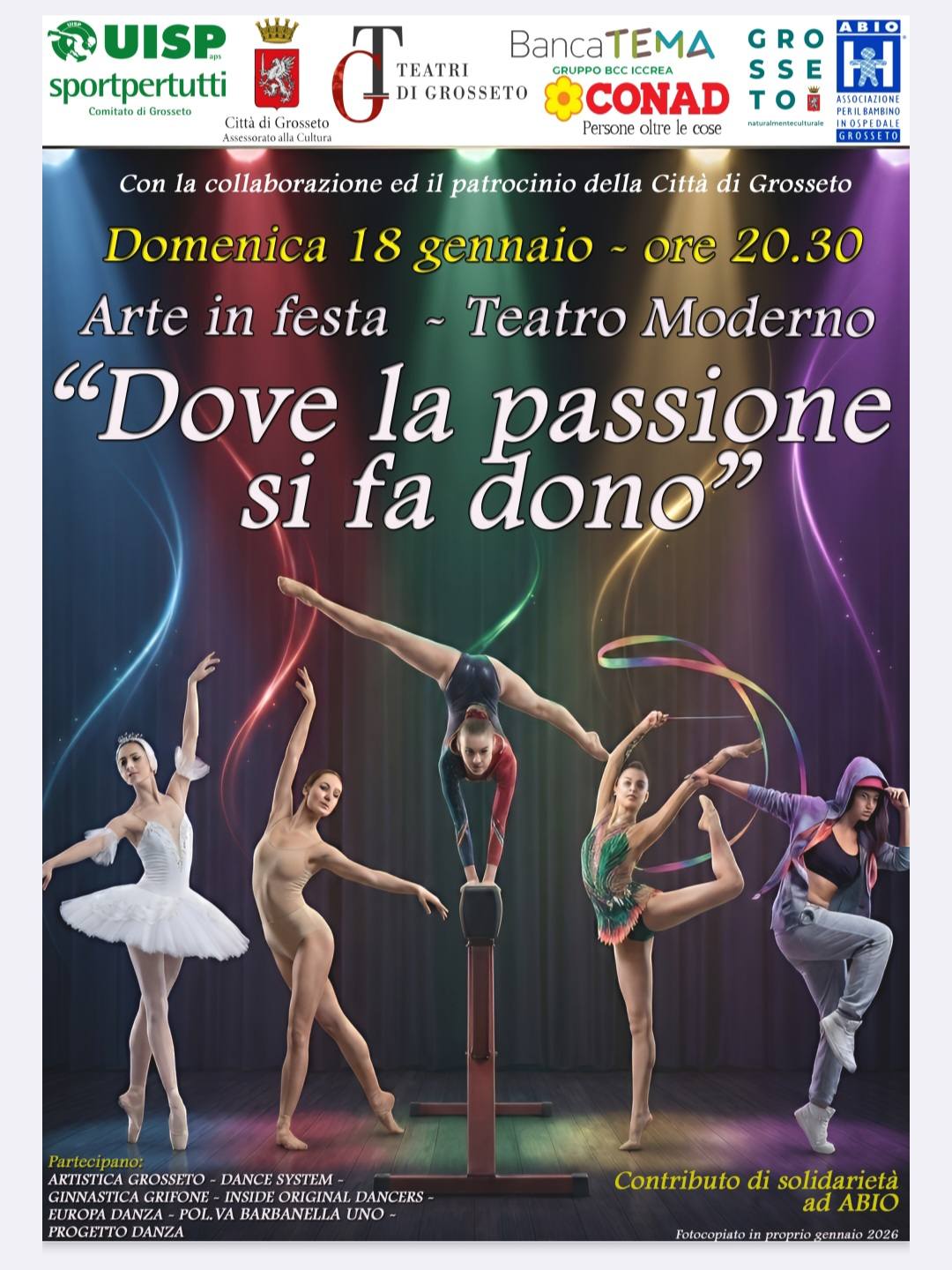 Domenica 18 gennaio, il sipario del Teatro Moderno di Grosseto si è alzato sulla quinta edizione di Arte in Festa, lo spettacolo teatrale promosso dal Comitato UISP Grosseto con il patrocinio del Comune di Grosseto.